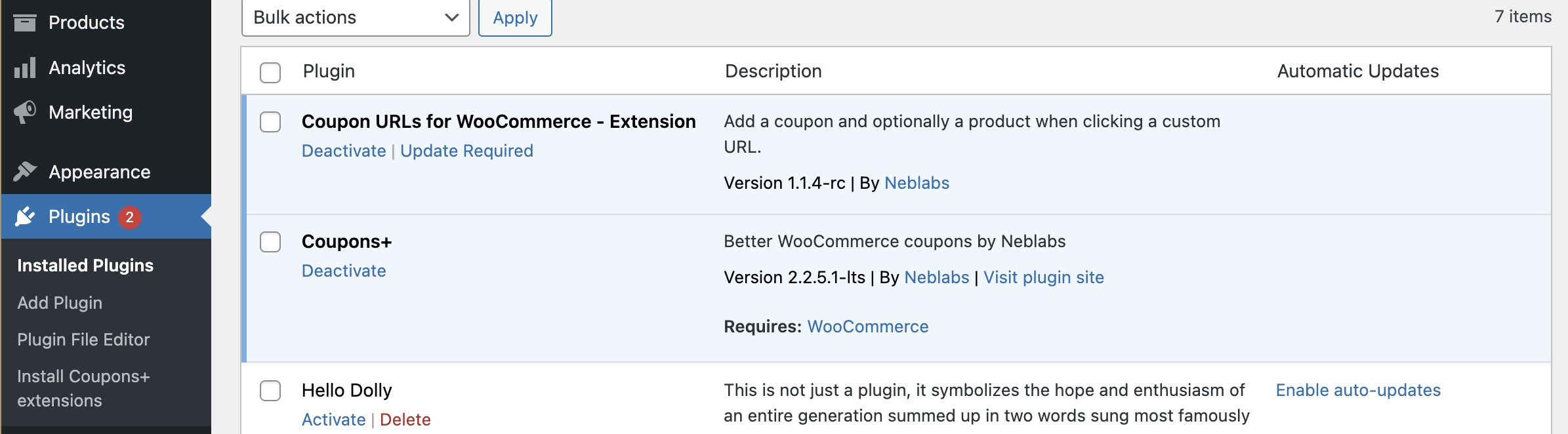 • Find Coupons+ (any version bellow 3) and Coupon URLs for WooCommerce – Extension and click Deactivate on both.