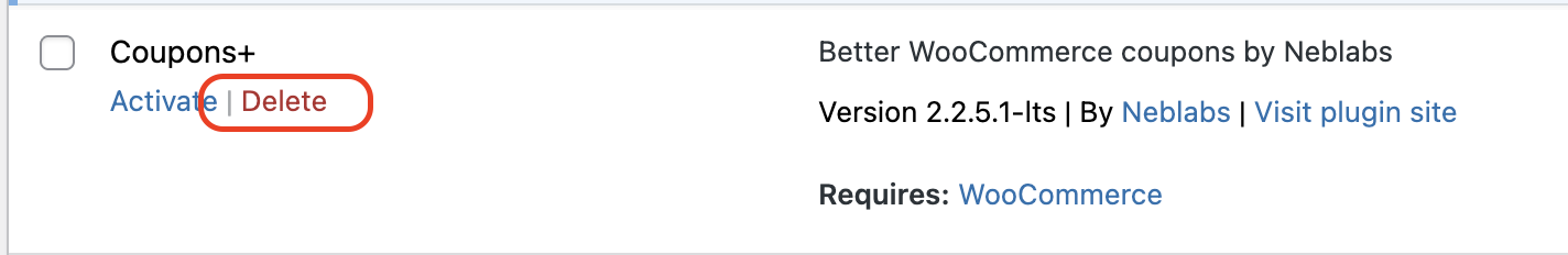• After deactivating, the “Delete” link will appear. Click Delete on both Coupons+ and Coupon URLs for WooCommerce – Extension.